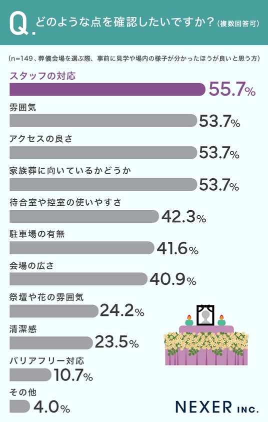 次いで「雰囲気」「アクセスの良さ」「家族葬に向いているかどうか」がそれぞれ53.7%で並びました。