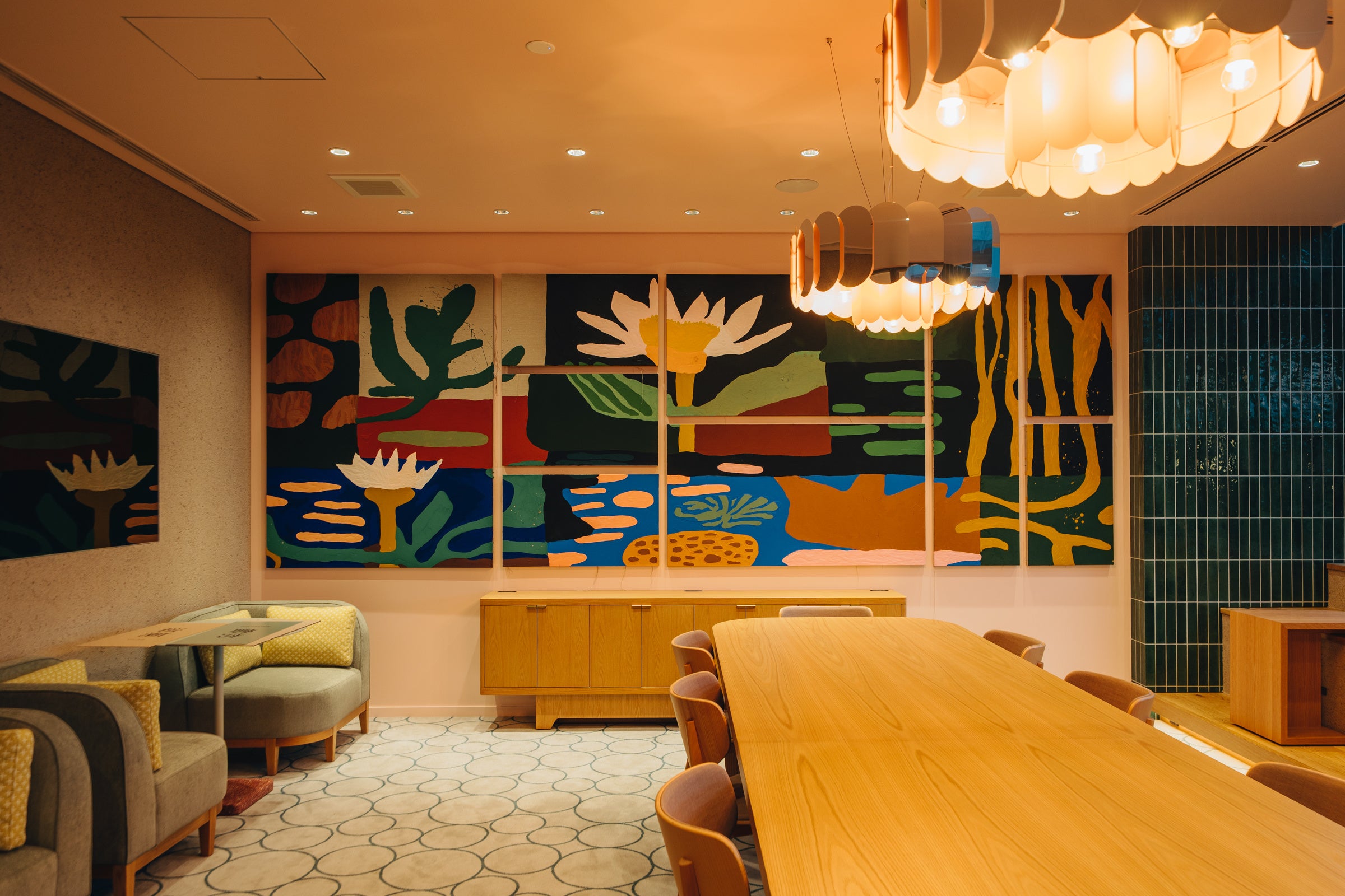 レセプションのある4Fでは、世界で活躍する2名のアーティストによるサウンドスケープとアートが皆様をお出迎えいたします。まずは音の景色。この場所にふさわしい空間をつくるため、サウンドスケープの制作依頼を作曲家のHIROSHI WATANABEさんにご依頼しました。近年は大阪関西万博「ウォータープラザ」エリアでの楽曲制作をご担当されるなど、国内外で活躍されています。