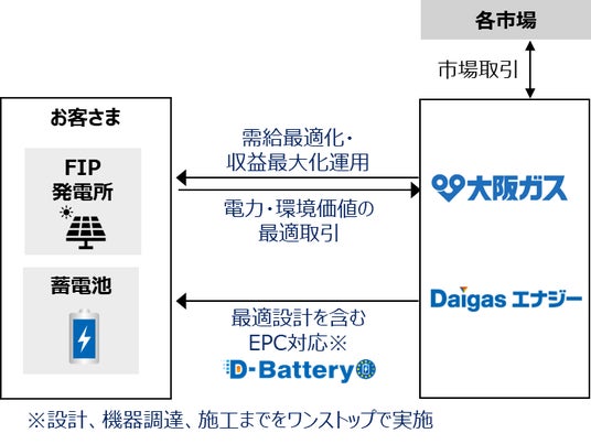 本事業では、Daigasエナジーが蓄電池の選定、基本設計、電力会社との連系協議などを進め、本発電所(発電容量約2MW)の敷地内に、定格出力約2MW、定格容量約6MWhの蓄電池を設置します。運用開始後は大阪ガスが蓄電池の遠隔制御を行います。また、本発電所はFIT制度※1からFIP制度※2への移行を予定しており、本発電所および本蓄電池を活用して発電・放電された電力の全量を大阪ガスが買い取る計画です。さらに、本蓄電池を活用した需給調整市場への参入により、電力系統の安定化へのさらなる貢献と収益の拡大を目指します。
