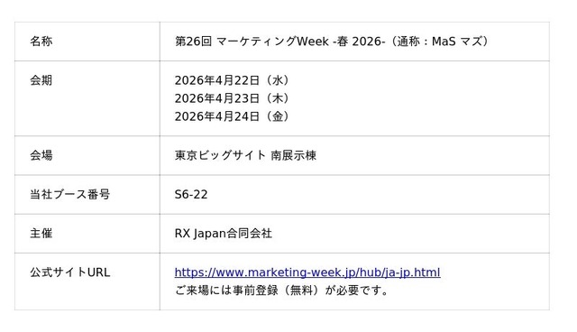 “次の一手”がデータでわかるMA+SFA一体型ツール「Kairos3(カイロススリー)」を提供するカイロスマーケティング株式会社(本社:東京都渋谷区、代表取締役:佐宗 大介、以下「当社」)は、2026年4月22日(水)~4月24日(金)までの3日間、東京ビッグサイトで開催される「第26回 マーケティングWeek -春 2026-」内の「営業支援 EXPO」に出展します。