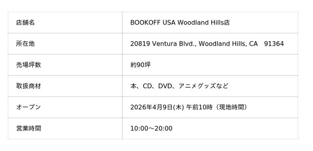 ブックオフグループホールディングス株式会社(本社:神奈川県相模原市、代表取締役社長:堀内 康隆、以下、ブックオフ)の海外グループ企業であるBOOKOFF U.S.A. INC.(代表取締役社長:平田 和也)は、アメリカ合衆国カリフォルニア州ロサンゼルス市に、現地にて買取・販売を行うリユース業態「BOOKOFF」の21店舗目となるWoodland Hills(ウッドランドヒルズ)店を現地時間の2026年4月9日(木)午前10時にオープンいたします。この出店により海外店舗数は50店舗を突破いたします。マレーシアなどにおいて日本から輸出した商品を販売するリユース業態Jalan Jalan Japan(ジャラン・ジャラン・ジャパン)事業立ち上げからの10年間で海外店舗数は4倍以上へと成長いたしました。コロナ禍の動画配信サービスの台頭などにより世界中でアニメ人気が加速したことが出店拡大の後押しとなっております。中期経営方針に基づき、海外事業では2033年にBOOKOFF事業で100店舗、Jalan Jalan Japan事業で100店舗の合計200店舗体制を目標に据え、今後も積極的に出店を進めてまいります。