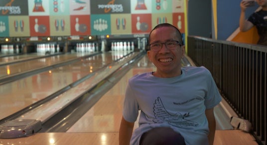 ボウリング場で笑顔で座っているドクさん(映画場面写真) (C) Kingyo Films Pte. Ltd.