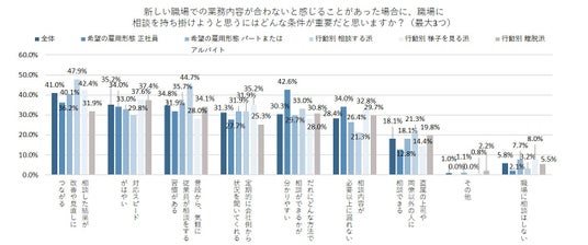 希望の雇用形態別にみると、「正社員」では「だれにどんな方法で相談できるかが分かりやすい」が42.6%で最も高くなった。話を聞いてもらいたいタイミングで行動できるように、方法と対象を把握しておきたいようだ。