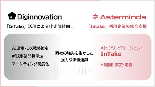 AIを活用した戦略策定・事業開発・マーケティングを推進・伴走するプロフェッショナルファームであるデジノベーション株式会社(本社:東京都杉並区、代表取締役社長:伊藤 友博、以下「デジノベーション」)と、AIヒアリングエージェント「InTake」を開発・提供するAsterminds株式会社(本社:東京都港区、代表取締役:本多 真二郎、以下「Asterminds」)は、カスタマーリサーチおよびコンサルティング領域における業務提携を開始したことをお知らせいたします。本提携により、「InTake」の活用範囲がカスタマーリサーチ・マーケティングリサーチへと拡大します。