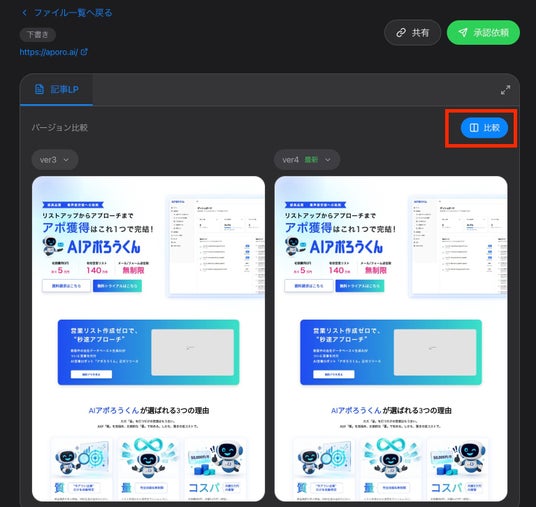 3. バージョン比較修正前後のCRを並べて比較する機能を搭載。動画は同一タイムコードでの並列再生が可能で、修正の反映漏れや意図しない変更を一目で発見できます。