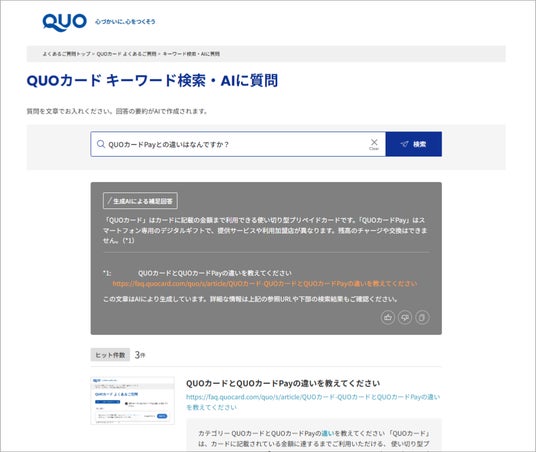 「Cogmo」では、生成AIが複数ページの内容を横断して要約回答を提示。FAQサイト内のページだけでなく、困りごとの解決につながるコーポレートサイト、および「QUOカード」「QUOカードPay」それぞれの商品情報を網羅し、混同せず最適な要約回答を提示できる点が高く評価されました。