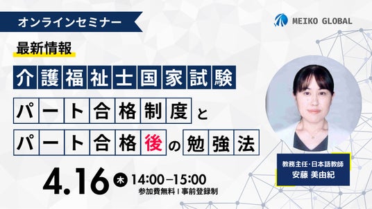 株式会社明光キャリアパートナーズ(代表取締役:中川 拓哉)は、2026年4月16日(木)に「介護福祉士国家試験の ”パート合格制度” と ”パート合格後の勉強法” 」オンラインセミナーを開催いたします。