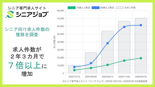 シニア転職支援の株式会社シニアジョブ(本社:東京都新宿区/代表取締役 中島康恵)は、運営するシニア専門求人サイト「シニアジョブ」に掲載された求人件数の推移について調べた結果、2023年12月から2026年3月までの2年3カ月の期間に、シニア向け求人件数が7倍以上と大幅に増加したことがわかりました。