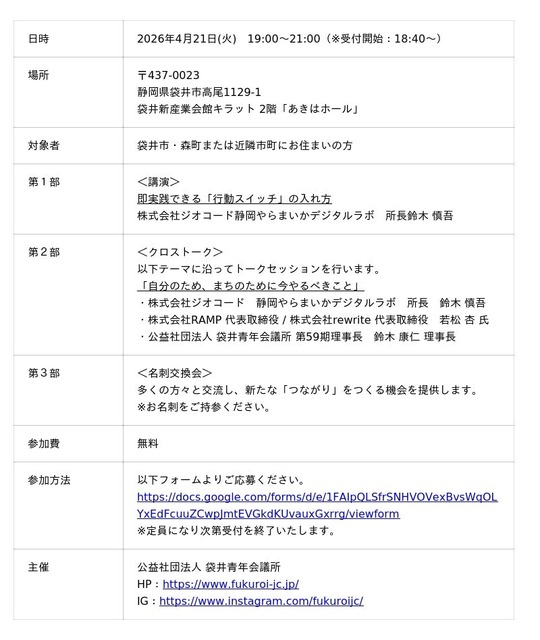 Webマーケティングとクラウドセールステック事業を展開する株式会社ジオコード(本社:東京都新宿区、代表取締役:原口 大輔、証券コード:7357)は、2026年4月21日(火)に公益社団法人 袋井青年会議所が主催する「発見!繋がる!!異業種交流会」において、静岡やらまいかデジタルラボ所長の鈴木慎吾が登壇・講演することをお知らせします。