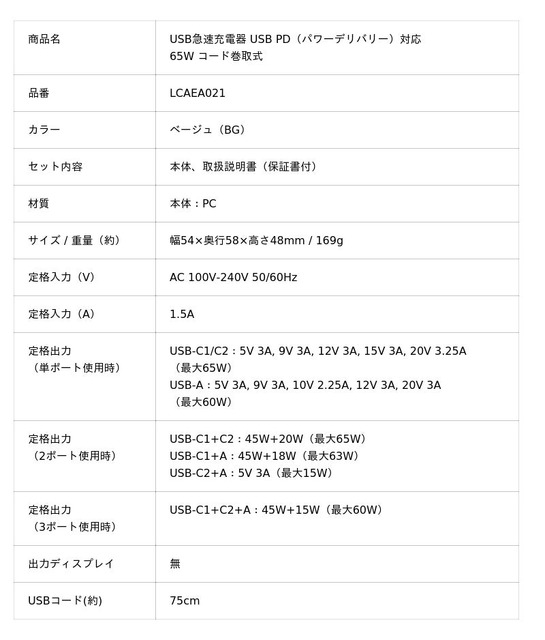 「USB急速充電器 USB PD(パワーデリバリー)対応 65W コード巻取式」LCAEA021