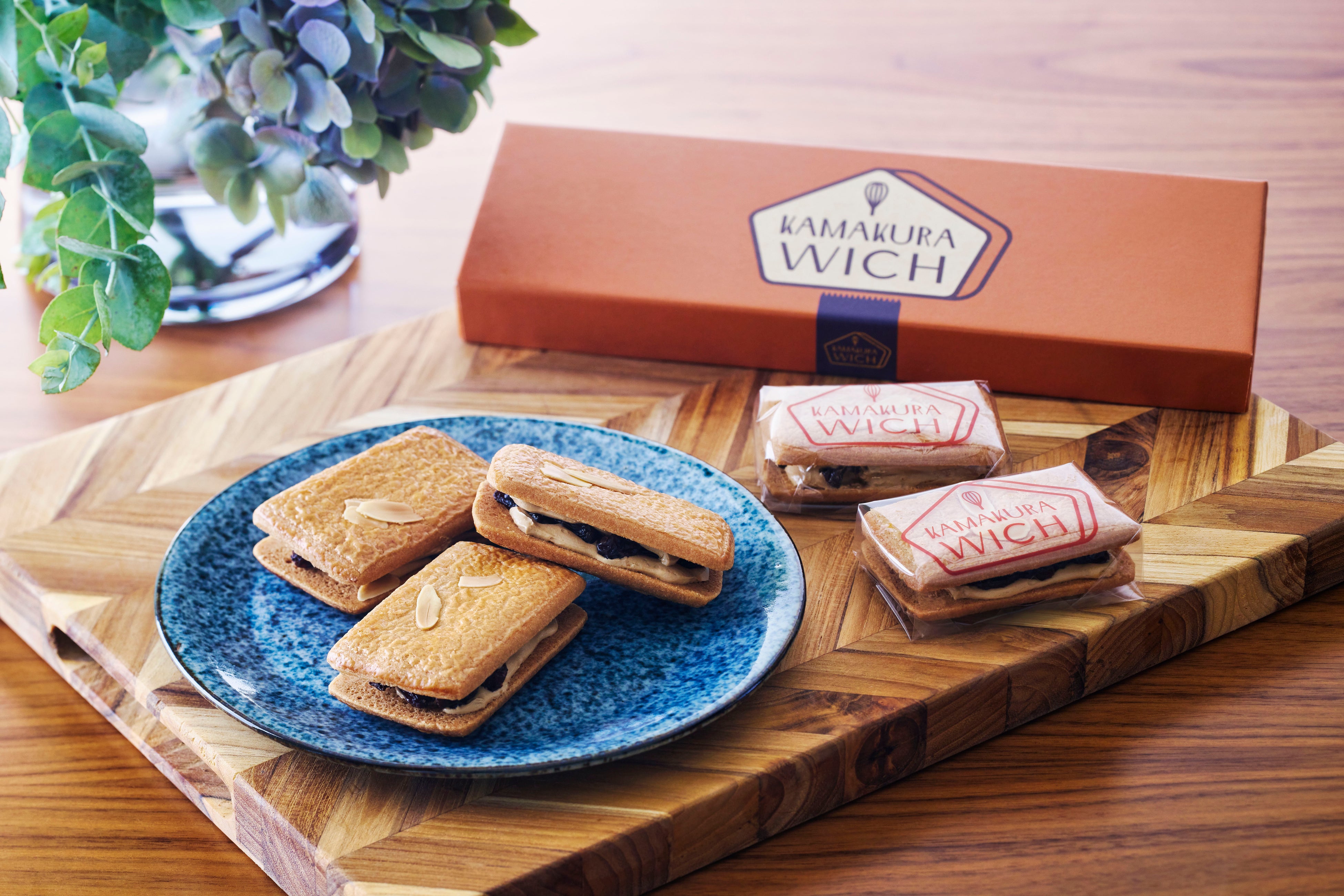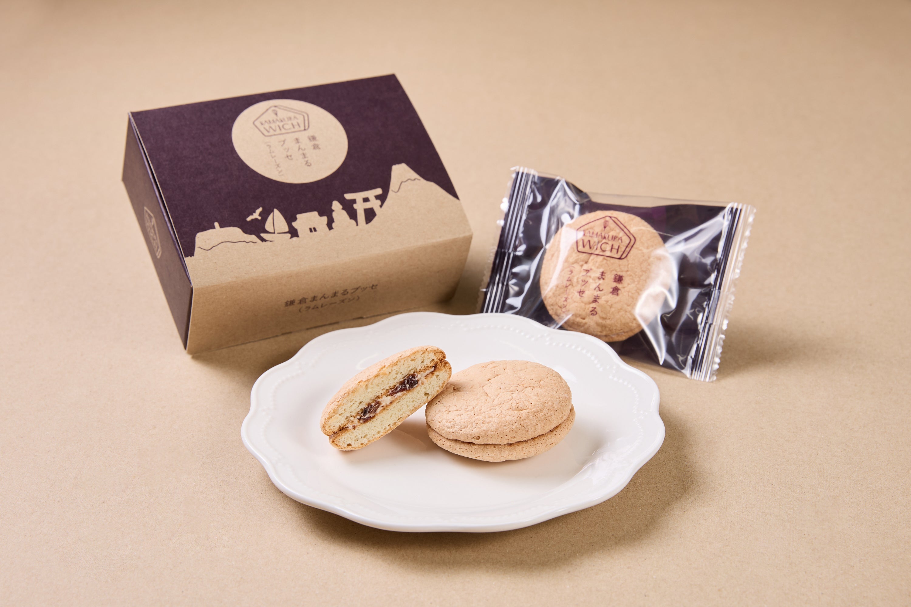 ふっくらとした自家製ラムレーズンと口どけの良い風味豊かなバタークリームを軽い食感のビスケット(鎌倉ビスケ)でサンド。『鎌倉ウィッチ』は煮上がった直後にラム酒を加えアルコール分を揮発させ、その後じっくり休ませることでレーズンにやさしく上品なラムの香りを閉じ込めています。
