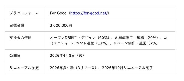 株式会社コネルが運営するイノベーションメディア「知財図鑑」は、2026年4月8日(火)より、ソーシャルグッドなクラウドファンディングプラットフォーム「For Good」にて、知財図鑑を誰もが投稿・探索・接続できるオープンデータベースへ進化させるためのクラウドファンディングを開始しました。目標金額は300万円で、2026年内のリニューアル完了を目指します。