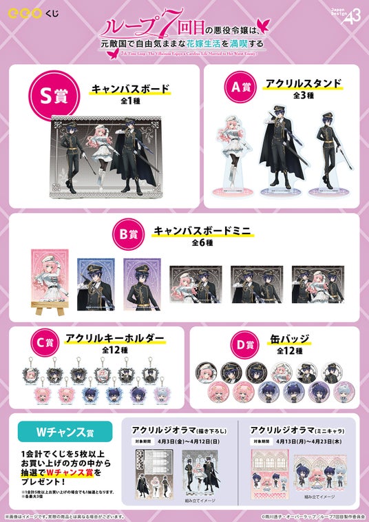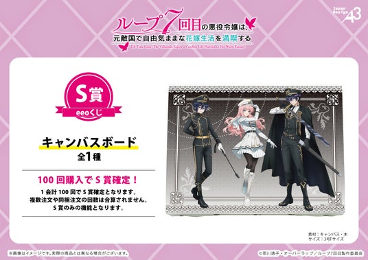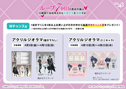 Wチャンス賞は各期間中、TVアニメ『ループ7回目の悪役令嬢は、元敵国で自由気ままな花嫁生活を満喫する』の「eeoくじ」を購入すると、抽選で当たります。