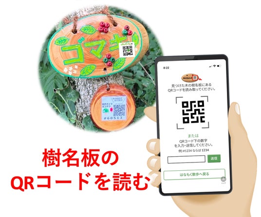 春のコースや樹木マスターコースに含まれている木を、デジタルマップを頼りに探し出します。木に掛けられた名札(樹名板)のQRコードを読み込んでクイズに解答!