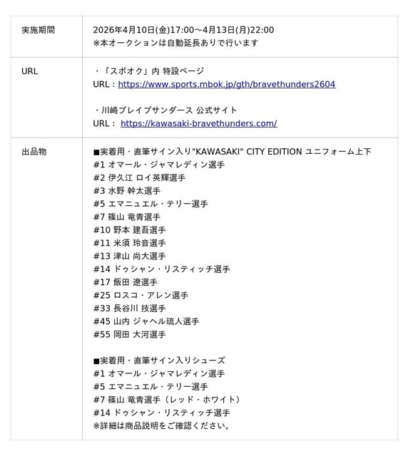 【川崎ブレイブサンダース 2025-26シーズンオークション 第1弾 概要】