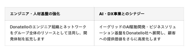 <株式会社イーグリッド 代表取締役CEO 小村 淳浩>今回のDonatello社との統合は、私たちにとって非常に戦略的で重要な一手です。イーグリッドはこれまで「IT×Xによりより良い社会を創造する」というビジョンのもと、ソフトウェア開発からAI・DXの実装支援まで事業展開してきました。しかし、急速に拡大する市場の需要に応えるには、開発力の土台となる高度エンジニア組織をさらに厚くする必要がありました。Donatello社は当社の創業時から共に協力関係で歩んできた親和性があり、かつ同社が積み上げてきた受託開発の実績と人材基盤は、まさにその答えのひとつです。グループとして一体となり、より高度なITサービスをお届けしてまいります。