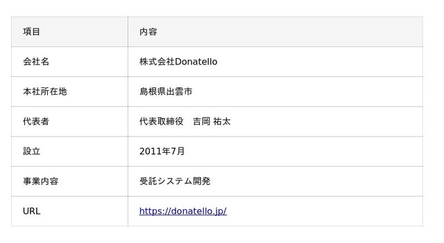 Donatelloは引き続き株式会社Donatelloとして事業を継続し、吉岡 祐太氏が代表取締役として経営を担います。イーグリッドグループの一員として、システム開発事業のさらなる拡充を推進してまいります。お客様・お取引先の皆様には、従来と変わらぬお引き立てを賜りますようお願い申し上げます。■ 株式会社Donatello 会社概要