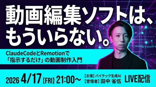 株式会社Librex(リブレクス)(本社:東京都渋谷区、代表取締役:塩田 稜、バイテック生成AIオンラインスクール運営)は、2026年4月17日(金)に、副業向けウェビナー「動画編集ソフトは、もういらない。」をオンラインにて開催いたします。 本ウェビナーでは、Claude CodeとRemotionを活用し、コードを書かずに動画制作を行う方法について、バイテック 業務効率化講師の田中氏が解説します。字幕の自動割り当てやAI動画風コンテンツの制作手法、繰り返し使える指示テンプレートの作り方など、今日から実務に取り入れられる実践的な内容をお届けします。