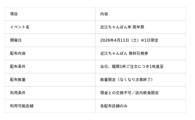 「近江のちゃんぽんをニッポンのちゃんぽんに!」をスローガンに掲げるドリームフーズ株式会社(本社:滋賀県彦根市/代表取締役社長:山本英柱)は、近江ちゃんぽん亭 JR神戸駅店(兵庫県神戸市)および近江ちゃんぽん亭 草津野路店(滋賀県草津市)がそれぞれ周年を迎えたことを記念し、2026年4月11日(土)に「周年祭」を開催いたします。
