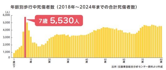 歩行中の交通事故死傷者数は、年齢別では7歳が最多となっています。背景として、小学校入学を機に登下校等で一人での行動が始まる一方で、小学3年生頃までは危険を察知し、回避する能力が心身ともに未発達であり、身長も低く車など周囲から認識されづらいことが要因として考えられています。