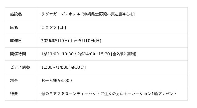 沖縄県宜野湾市のラグナガーデンホテル(株式会社 ラグナガーデンホテル)は、母の日に向けた特別企画として、カーネーションプレゼントとピアノ生演奏を楽しめる「母の日限定アフタヌーンティー」を、2026年5月9日(土)・10日(日)の2日間限定で開催致します。