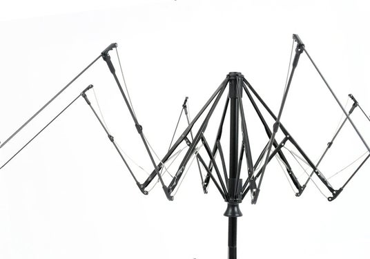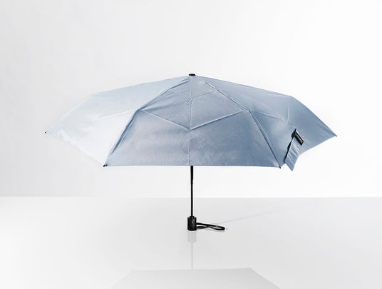 自動開閉機構と遮光生地を搭載した折りたたみ傘は、構造上重くなりやすい傾向があります。アンベルは親骨の先端に、航空機にも使われる軽量かつ高い弾力性を備えたカーボンファイバーを採用することで、この課題を解決。すべての機能を搭載しながら約210g(傘袋含む)を実現しました。