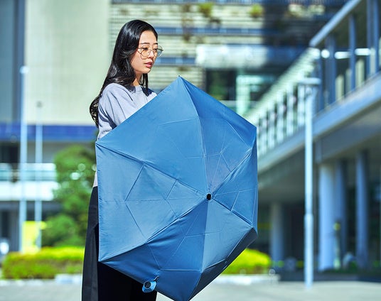 自動開閉・超軽量・100%遮光という3つの要件を備えた傘が、唯一抱えていた課題が「たたむ所作」でした。本製品は融点の異なる2種類のポリエステル糸を組み合わせた繊維を使用しています。