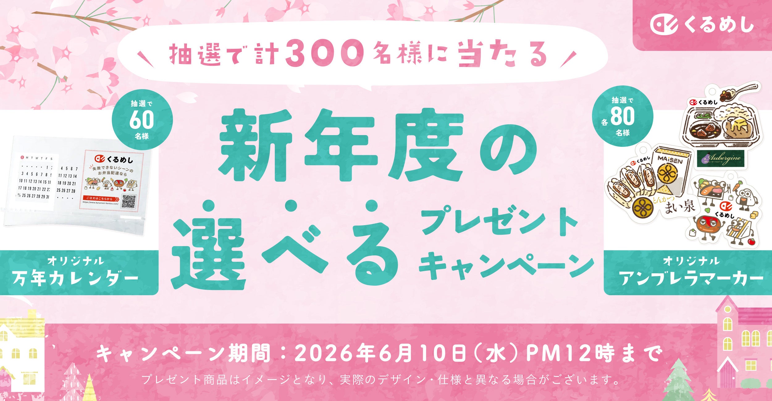 国内最大級の法人向け弁当デリバリーサービス「くるめし弁当」(運営:株式会社くるめし、本社:東京都渋谷区、代表取締役:小林 篤昌)は、LINE公式アカウントの友だち追加で抽選プレゼントが当たる「新年度の選べるプレゼントキャンペーン」を、2026年06月10日(水)まで開催しています。期間中、くるめし弁当のLINE公式アカウントを友だち追加の上、専用フォームから必要事項を記入して応募いただいた方の中から、抽選で合計300名様に「オリジナルアンブレラマーカー」など、くるめしオリジナルノベルティをプレゼントいたします。