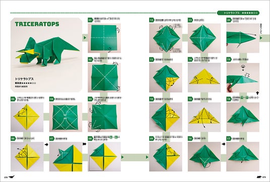 ティラノサウルスやトリケラトプスといった人気恐竜はもちろん、アンモナイトやマンモスなどの古代生物も収録。すべて「切らずに1枚」で折れる本格派の折り紙作品として再現できます。