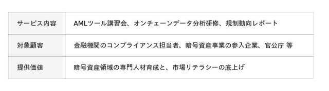 BCIは、グローバルAMLツールベンダーとの連携による導入支援・運用体制構築、オンチェーンデータ分析に基づく市場動向レポート・ダッシュボードの提供、およびAML・オンチェーン分析に関する教育プログラムを展開し、暗号資産交換業者・ステーブルコイン発行事業者・金融機関・官公庁・事業会社を対象にサービスを提供します。