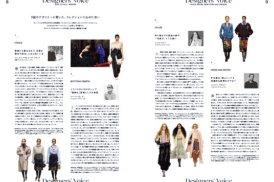 デザイナーインタビューでは、「プラダ(PRADA)」「ボッテガ・ヴェネタ(BOTTEGA VENETA)」「ロエベ(LOEWE)」「ジバンシィ(GIVENCHY)」「クロエ(CHLOE)」「ドリス ヴァン ノッテン(DRIES VAN NOTEN)」など、そうそうたるブランドのファッションショーが終わるや否やバックステージに駆け込んで突撃したデザイナーの思いを掲載しています。「プラダ」はなぜ、60ルックをたった15人のモデルで見せたのか?「ボッテガ・ヴェネタ」のルイーズ・トロッター(Louise Trotter)はどうして“控えめなラグジュアリー”だったブランドでドラマティックなコレクションを目指したのか?「ロエベ」のデザイナーデュオが定義する新しいブランドの哲学とは?など、彼らのインタビューには、今という時代を理解する上で大事な価値観が見え隠れします。