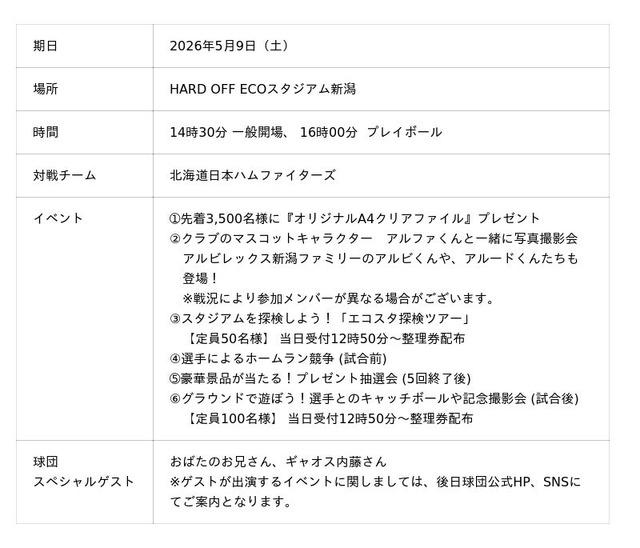 2026年5月9日(土)の観戦チケットを、新潟県内のコメリ各店舗にてプレゼントいたします。