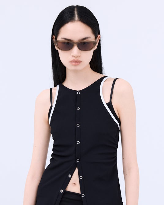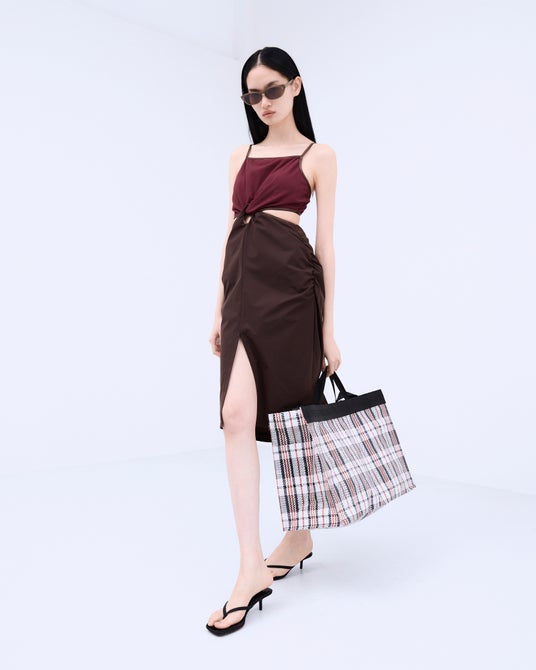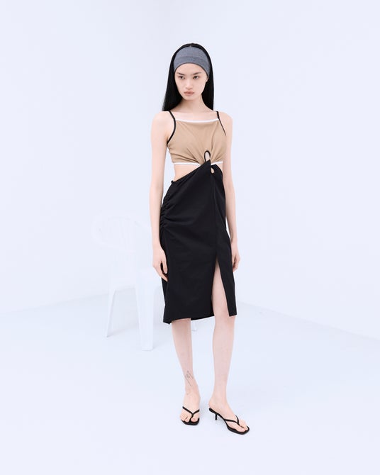 ボトムス:GATHERED TAFFETA SWIM BOTTOM ¥17,600(tax in) Color:BROWN / BLACK