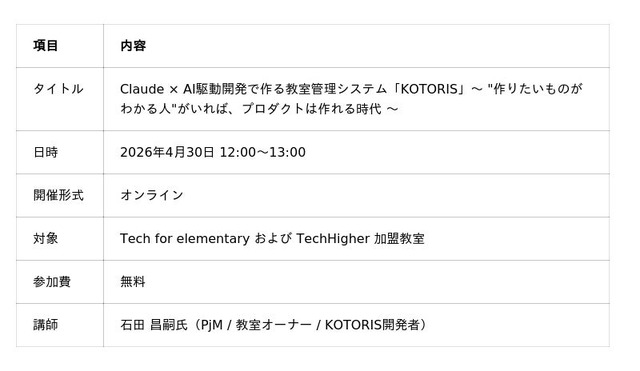 10代向けデジタル人材育成サービス『TechHigher』を運営する株式会社エクシード(本社:東京都渋谷区、代表取締役:澤部愛子)は、Tech for elementary および TechHigher 加盟教室を対象に、オンラインセミナー 「Claude × AI駆動開発で作る教室管理システム「KOTORIS」~ "作りたいものがわかる人"がいれば、プロダクトは作れる時代 ~」 を2026年4月30日12時より開催します。