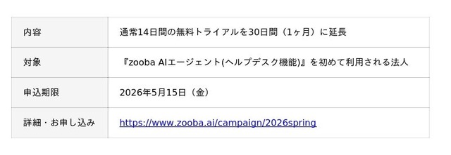 「zooba AIヘルプデスクエージェント」春の無料トライアル延長キャンペーン