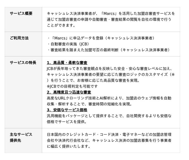 株式会社ジェーシービー (本社:東京都港区、代表取締役会長兼執行役員社長:二重 孝好、以下:JCB)は、キャッシュレス決済事業者向けの「加盟店審査サービス」の提供を開始いたします。本サービスは、JCBが長年にわたり培ってきた審査ノウハウと、セカンドサイトアナリティカ株式会社(本社:東京都千代田区、代表取締役社長:高山 博和、以下:セカンドサイトアナリティカ)のAI・データ分析技術を融合させた加盟店審査システム「Marcs」の活用により、キャッシュレス決済事業者における加盟店審査業務の品質向上と効率化が可能になります。