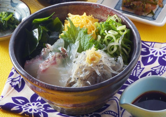 ぷりぷりの食感がクセになる岩屋漁港で水揚げされた鮮度抜群の生しらすと鯛の松皮造りをトッピングした淡路米の丼ぶりです。みけ家特製醤油と生姜でさっぱりとお召し上がり下さい。