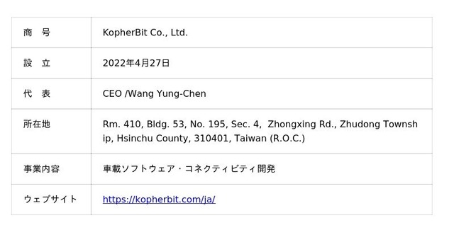 KopherBitは、台湾の技術研究院(ITRI)からスピンアウトしたスタートアップ企業です。TCU/OTAを中心とした車両向けソフトウェアプラットフォームの開発を行い、電動車両を含む次世代モビリティ分野におけるソフトウェアソリューションの提供に取り組んでいます。