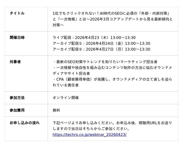 本ウェビナーは、2026年3月に発生したGoogleコアアップデートの傾向・対策と合わせて解説。