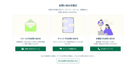 このような場面で、電話やフォームといった直接の連絡先が別ページに分かれていたり、階層の深い場所に配置されていたりすることは、利用者が強いストレスを感じる原因です。適切な窓口が見つからないという分かりにくさは、疑問の解消を諦めさせてしまうだけでなく、企業に対する信頼感の低下を招きかねません。