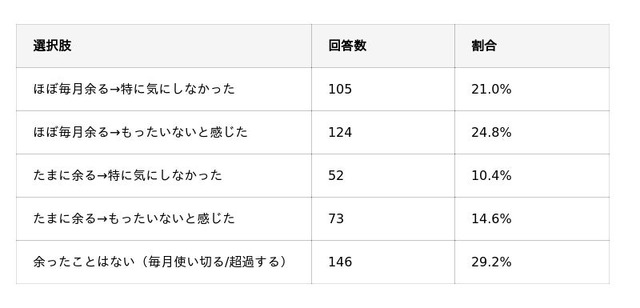 データ容量が余った経験を尋ねたところ、70.8%が「余った経験がある」と回答。そのうち「もったいない」と感じた人は39.4%に上り、データ有効活用へのニーズが裏付けられました。