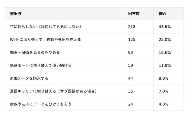 最多は「特に何もしない」(43.6%)で、データ不足を深刻視しないユーザーが多数派です。対処する層は「Wi-Fiに切り替え」(25.0%)や「動画・SNSの利用制限」(18.6%)で通信量を抑えています。