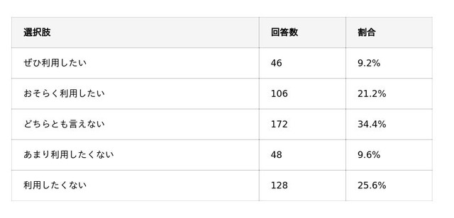 利用意向あり(30.4%)と否定的(35.2%)が拮抗し、「どちらとも言えない」が34.4%で最多。仕組みや安全性の訴求次第で意向が変わる可能性があります。