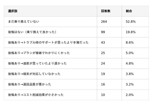 乗り換え済みユーザー(236名)のうち41.9%が「良かった」と回答。後悔理由の1位は「サポートが手薄」(18.2%)で、Q8の結果と一致します。