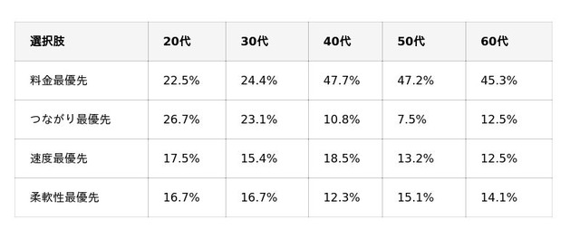 全体では「料金の安さ」が31.6%で1位ですが、20代は「コミュニティ」(26.7%)が「料金」(22.5%)を上回る結果に。40代以上は「料金最優先」が約半数を占め、年代による価値観の違いが鮮明です。