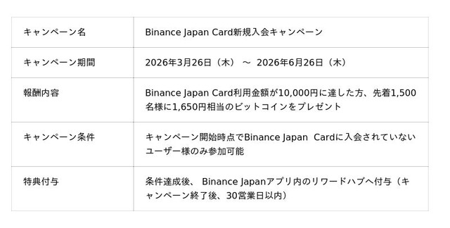 本キャンペーンでは、期間中にBinance Japan Cardに新規お申し込みいただき、合計10,000円以上ご利用いただいた先着1,500名様に、1,650円相当のビットコイン(BTC)をプレゼントいたします。これにより、クレジットカード2年目以降の年会費(税込1,650円)が実質無料となります。