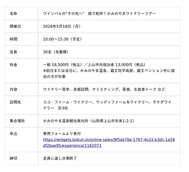 - 「かみのやまワイナリーツアー」詳細・申込先