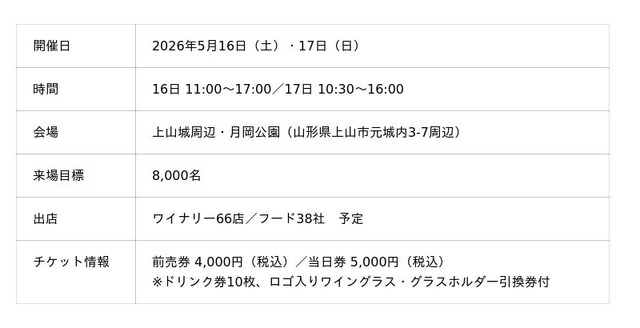 「山形ワインバル2026」は、上山城周辺・月岡公園を会場に開催される日本最大級の屋外ワインイベント。全国から66ワイナリーが集結し、450種類以上のワインを味わえます。