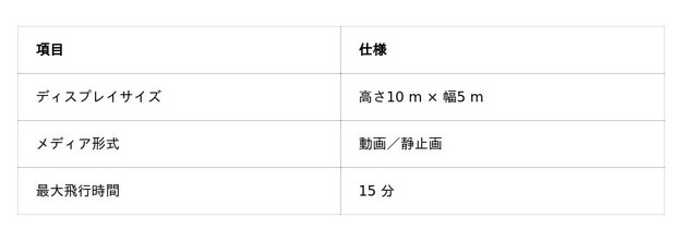 高さ10m × 幅5m という、地上3階建て住宅に匹敵する巨大なスクリーンが空に出現し、圧倒的な視認性を誇ります。