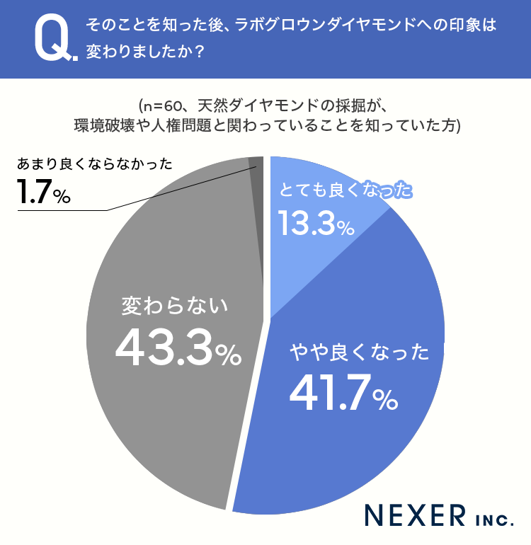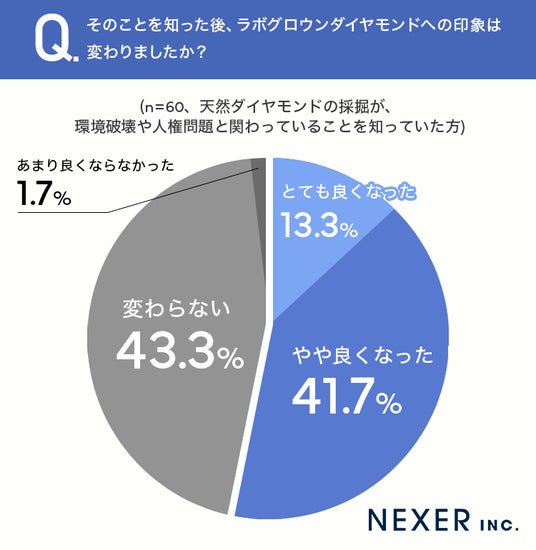 続いて、ラボグロウンダイヤモンドが「採掘不要で環境負荷が少ない」ことを知った後、印象が変わったかどうかを聞いてみました。